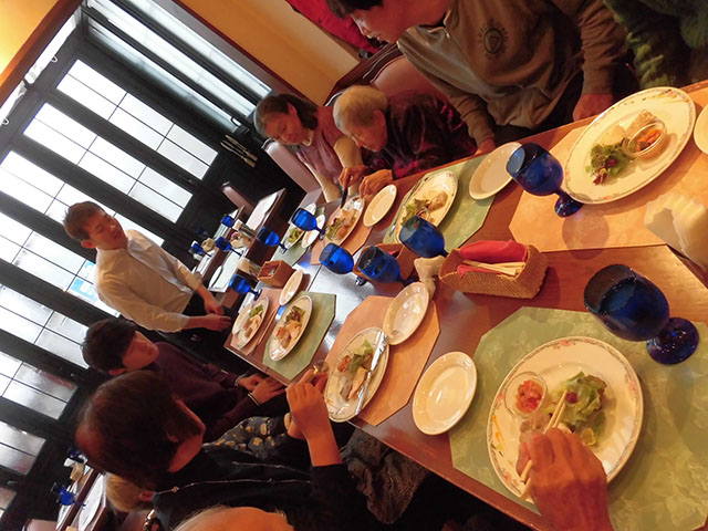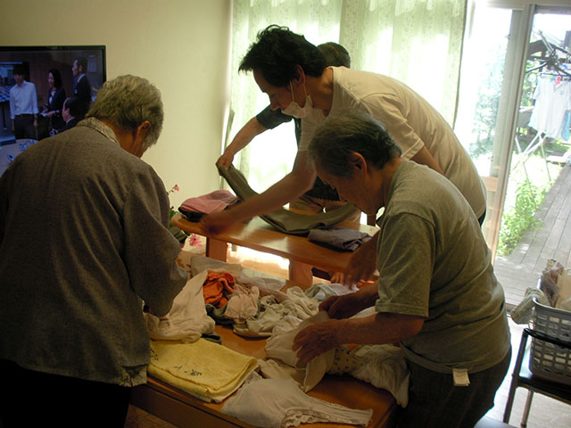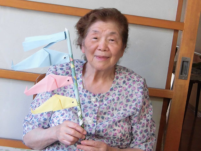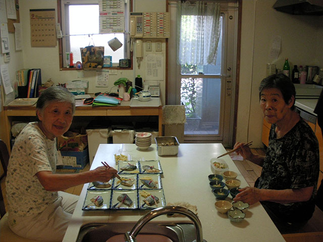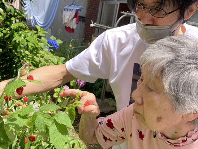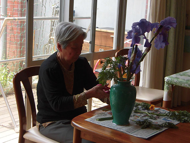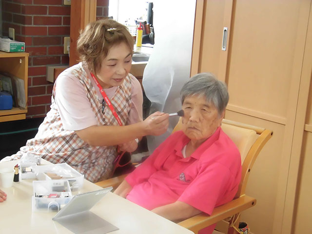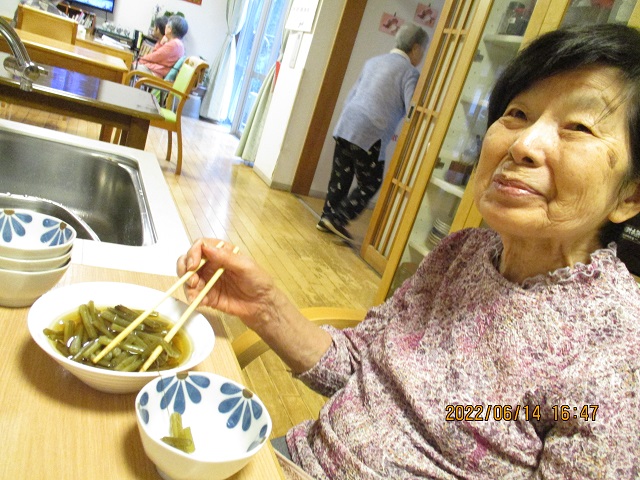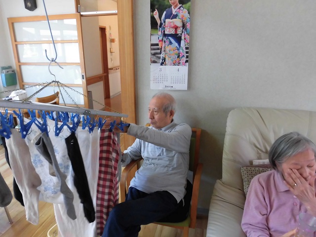 - 生活の支援を行い、生活の中でのリハビリに心がけます。職員はご利用者一人ひとりの能力に応じた支援をします。例えば、料理は大切な生活リハビリの一つです。包丁を使って皮むきをする、天ぷらを上手に揚げる入居者の方もいます。片付けや洗い物を率先してくれるご入居者等、ひとりひとりができることを生かし生活しています。